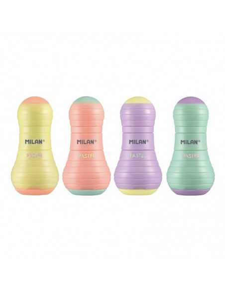 Combinación de goma y sacapuntas con depósito. Diseño SWAY, edición Pastel. El sacapuntas dispone de una cuchilla de acero afilada y resistente, ideal para todo tipo de lápices. Sacapuntas con cuchilla de seguridad:este sistema evita que se pueda sepla hoja del cuerpo del sacapuntas. 4 colores surtidos: amarillo, lila, naranja y turquesa. Diseño original creado por el departamento de I+D de MILAN.